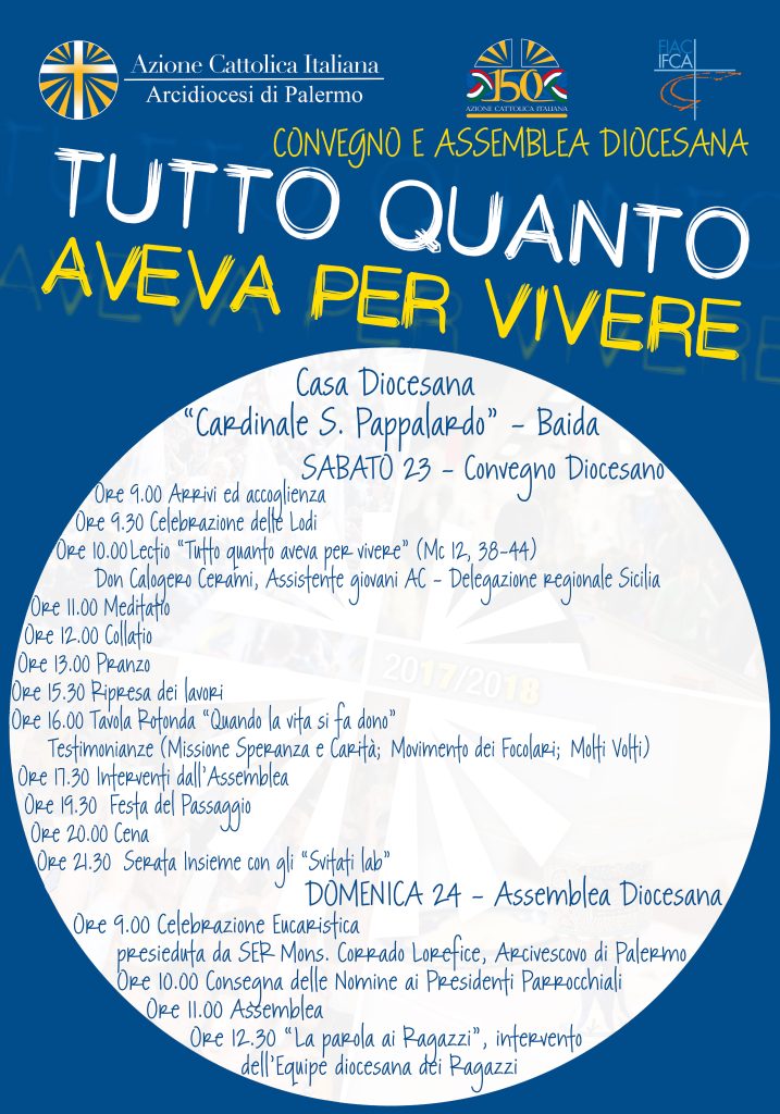 Carissimi, ricordiamo che il 23/24 Settembre 2017 presso la Casa Diocesana “Cardinale S. Pappalardo” – Baida, è in programma il tradizionale convegno-assemblea di apertura del nuovo anno pastorale e associativo. Per informazioni e prenotazioni rivolgersi alla segreteria diocesana entro domenica 17 settembre attraverso i seguenti canali: Whatsapp – Gruppo presidenti e-mail – segreteria_ac@diocesipa.it Diamo massima […]