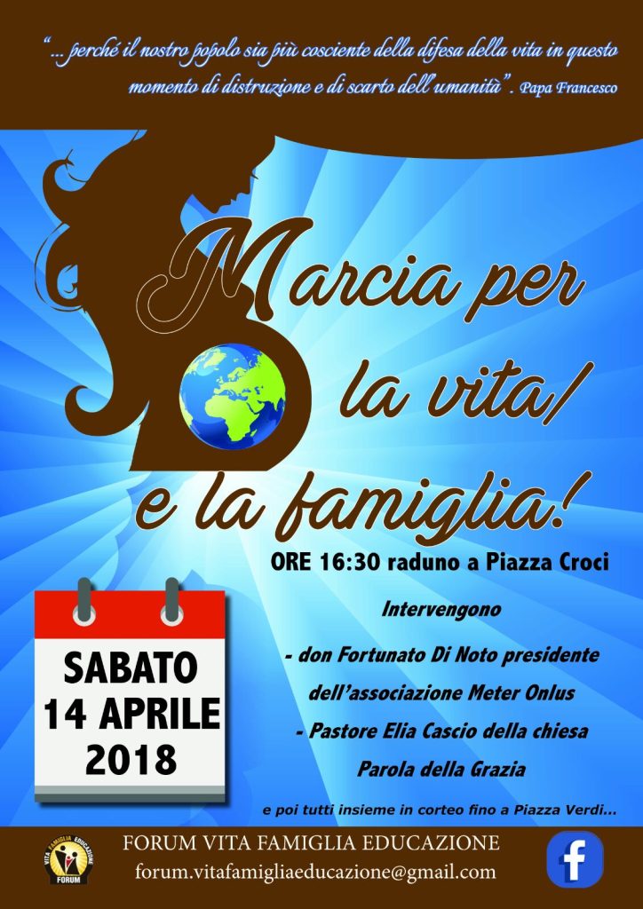 Carissimi, vi invitiamo a partecipare alla Marcia per la vita e la famiglia, che si terrà il 14 aprile 2018 con inizio alle ore 16.30 con raduno presso Piazza Croci a Palermo.